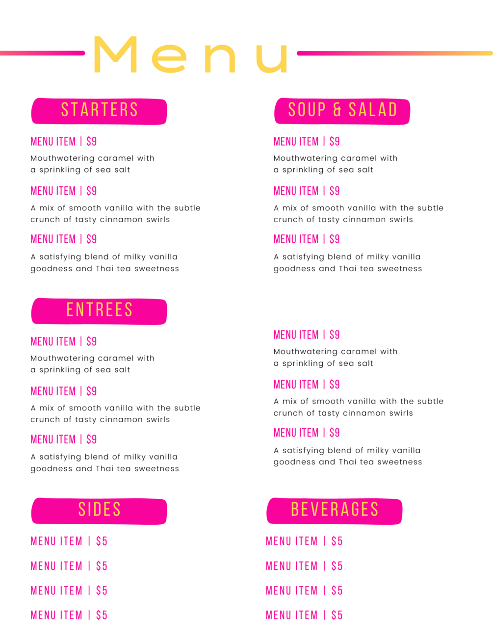 Designing a Restaurant Menu can be time-consuming and requires a lot of thought, research, and creativity. These templates can be used for Casual, Simplistic, Fun, and Vibrant Menu Style. You will still need to input your specific menu items, pricing, and descriptions, or you have our Menu Designers do it for you by booking our menu services.
